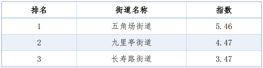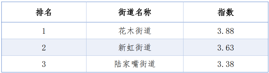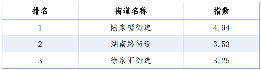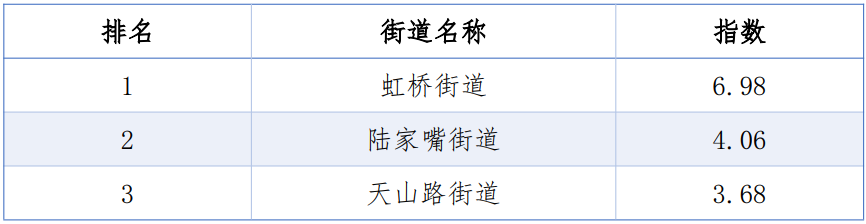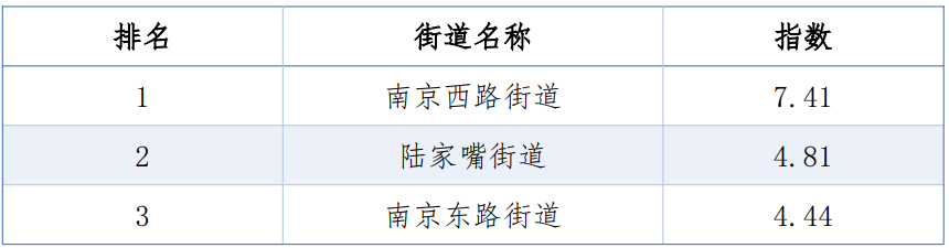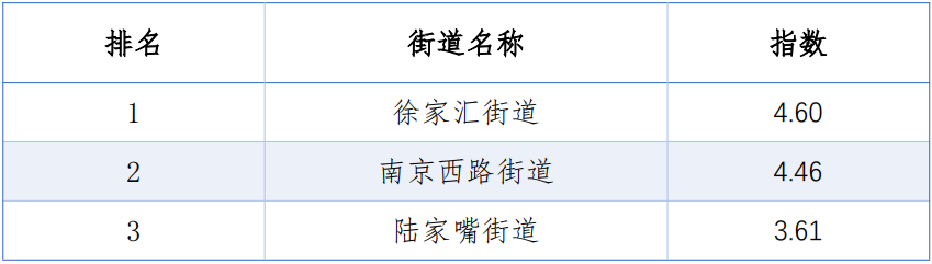 同时,从TOP20的排名看,三年来除了第1、第6名未变动外,其余均有不同程度的上下波动,其中虹桥街道由第5名上升到第2位;淮海中路街道由第16名上升到第9名;新虹街道由第21位上升到第12名;陆家嘴街道则连续三年荣登榜首。