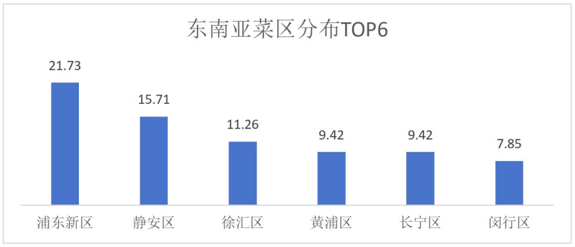 4.东南亚菜分布指数。主要包括新加坡、马来西亚、泰国、越南、印尼、菲律宾、缅甸、柬埔寨、老挝、文莱等国家的菜系,共382家,其中泰国菜185家、越南菜89家、新加坡菜60家分别位居前三。