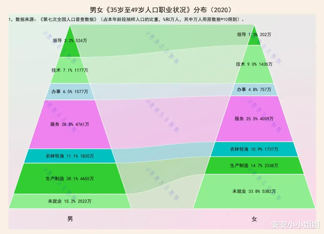 根据2020年第七次全国人口普查数据绘制的职业分布图,清晰展现了这一年龄段男女劳动者的就业状况与行业分布。