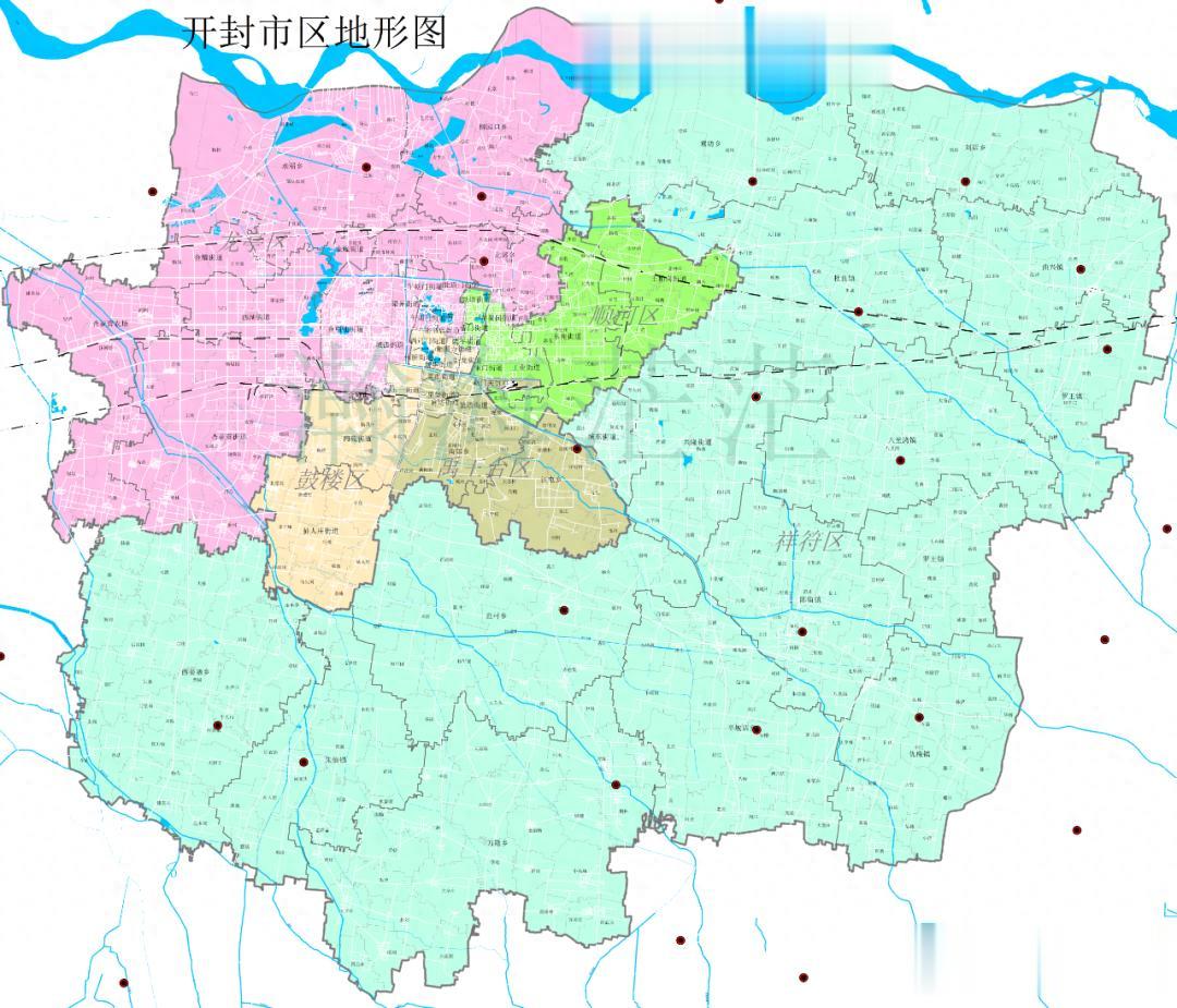 我们在开封市村界的基础上,制作了开封市乡镇街道地图。本来准备乡镇街道设色,但是开封市区的街道非常小,无法进行乡镇设色,否则看起来会非常杂乱,就决定按照区县涂色,加上乡镇街道边界、村庄边界。我们把河流、湖泊、铁路、地铁、高速公路、国道,公路,其中由于SHP的原因,高铁和铁路一个标志,各种公路都是一个标志,都显示到地图中,这样就形成了开封市区简图如下: