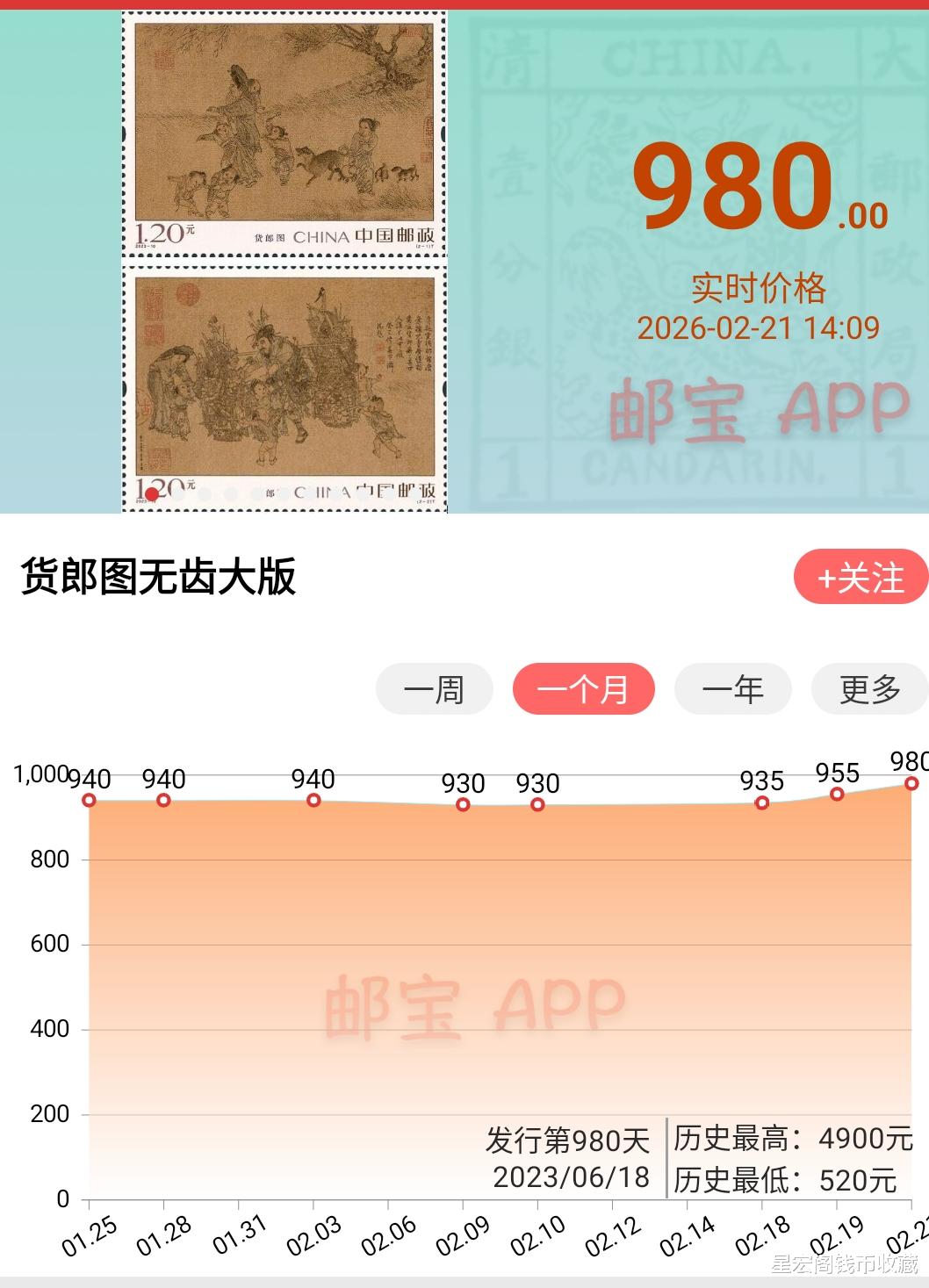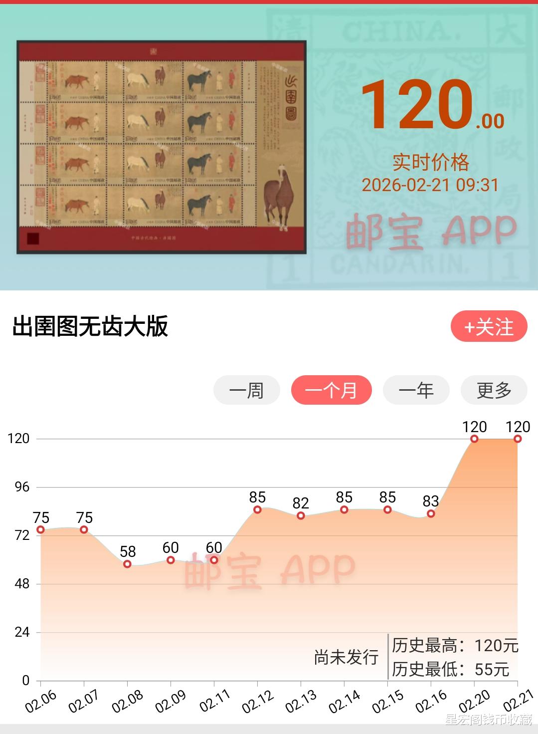 到今天最新的市场行情,也已经上涨到了120元以上,按照目前的行情来看,很有可能还会继续上涨。当然能不能跟《货郎》无齿大版邮票市场行情持平,我个人认为也是比较的困难,现阶段来看,主要还是看后期的发行量,如果发行量非常少,还有一定的上涨空间。