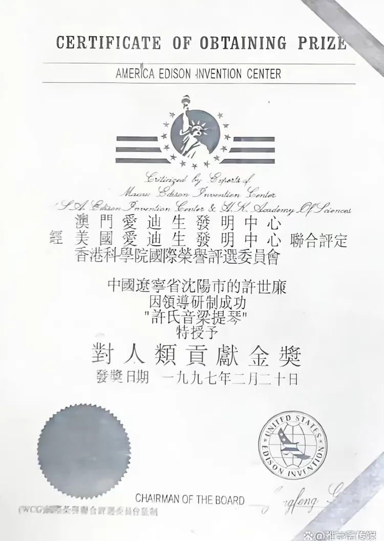 国际发明中心颁发的《对人类贡献金奖》证书