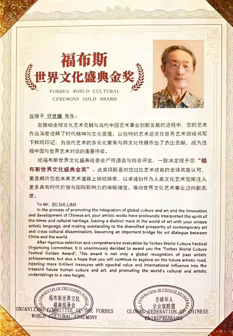 福布斯《世界文化盛典金奖》证书