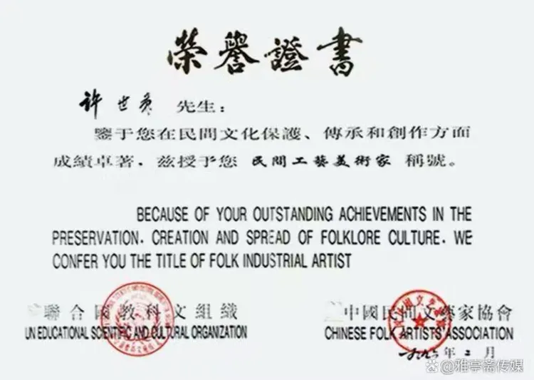 联合国教科文组织颁发的《民间工艺美术家》证书