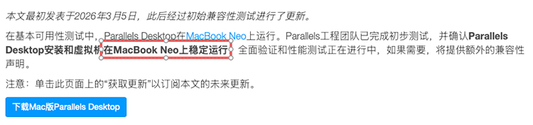 在3月12日,Parallels在公告中表示,他们的工程师团队完成初步测试后,确认Parallels能在MacBook Neo上稳定运行Windows系统,既能在iPhone上面跑iOS,又放到笔记本电脑上跑macOS,还顺便能兼容Windows,这颗A18 Pro手机芯片的人生真的是圆满了。