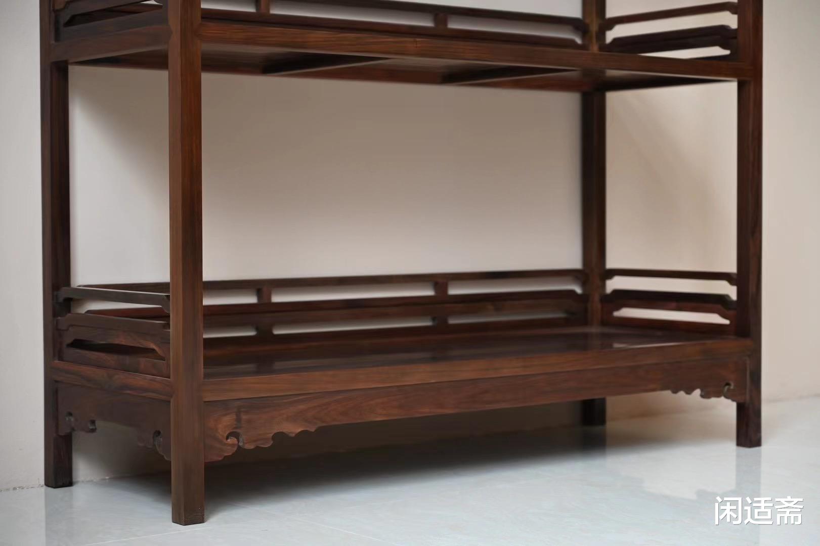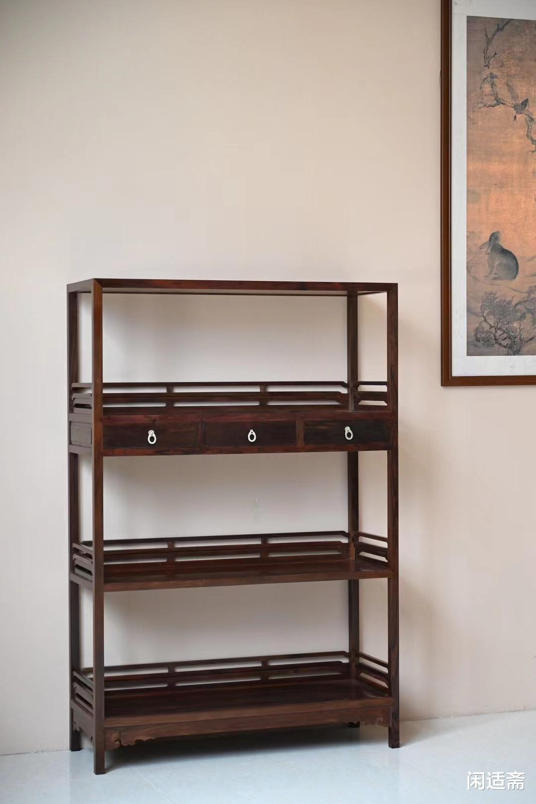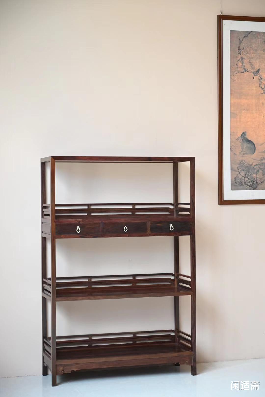 架格通体以“方中见圆”为设计理念,比例严格遵循原器“高宽黄金比1.5:1”的标准,视觉上沉稳大气又不失灵动。框架采用“格角榫”拼接,立柱与横枨衔接处严丝合缝,上层与中层设围子栏杆,栏杆以“竖棂+横枨”组合,既保证陈列安全性,又不遮挡器物观赏;栏杆转角处做圆角处理,线条柔和流畅,避免了硬木的生硬感。层下增设抽屉设计,抽屉面板光素无纹,抽屉可收纳小件文玩、印章等物品,实现“藏展结合”的实用功能。架格腿足线条挺拔有力,从底部直承顶层,与整体形制呼应,增强了架格的稳定性与古典韵味。