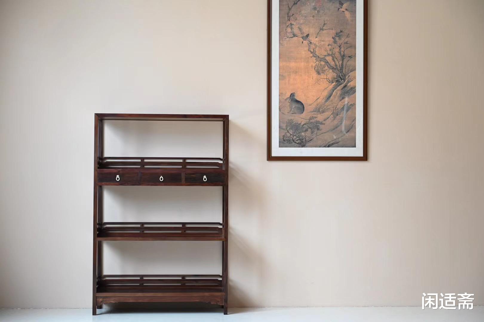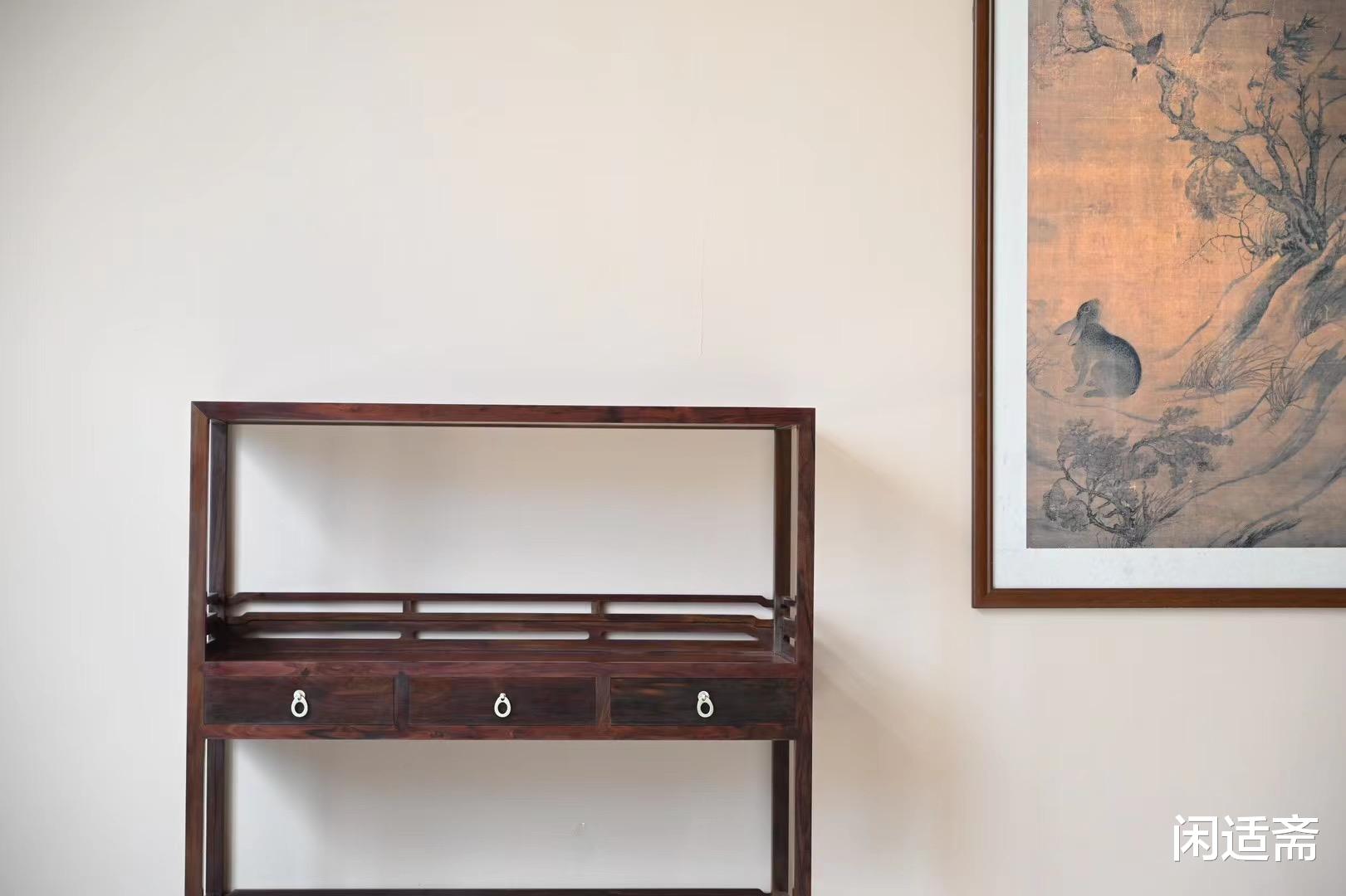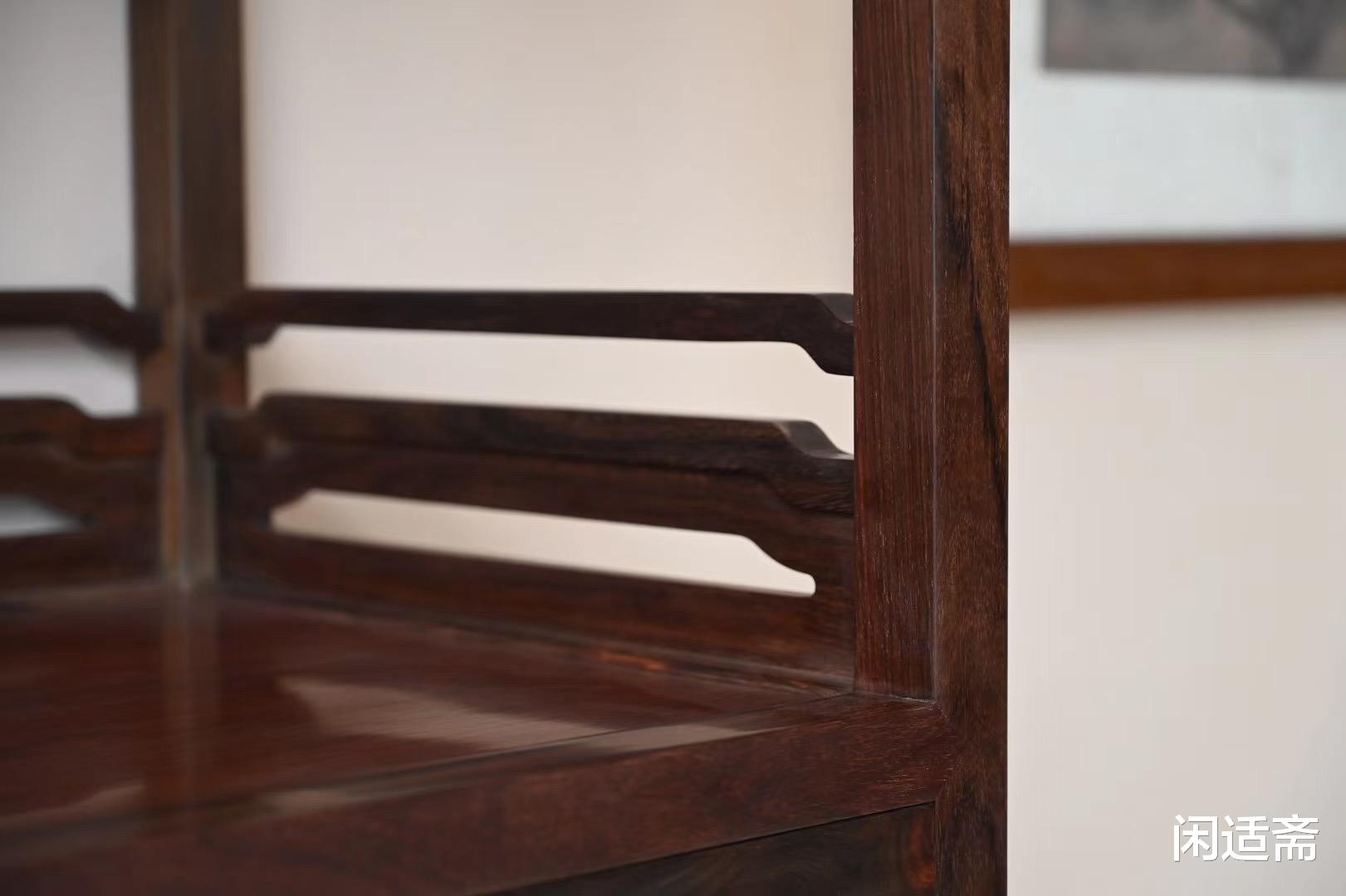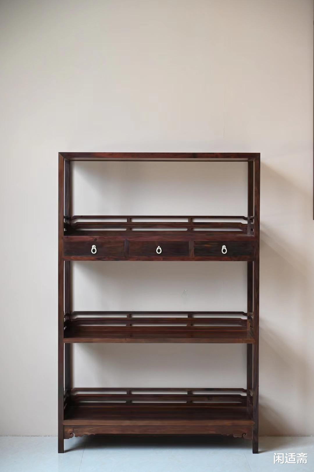 架格通体以“方中见圆”为设计理念,比例严格遵循原器“高宽黄金比1.5:1”的标准,视觉上沉稳大气又不失灵动。框架采用“格角榫”拼接,立柱与横枨衔接处严丝合缝,上层与中层设围子栏杆,栏杆以“竖棂+横枨”组合,既保证陈列安全性,又不遮挡器物观赏;栏杆转角处做圆角处理,线条柔和流畅,避免了硬木的生硬感。层下增设抽屉设计,抽屉面板光素无纹,抽屉可收纳小件文玩、印章等物品,实现“藏展结合”的实用功能。架格腿足线条挺拔有力,从底部直承顶层,与整体形制呼应,增强了架格的稳定性与古典韵味。