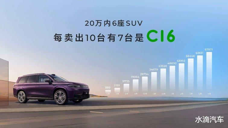 实打实的销量是最好的背书:零跑C16自2024年6月正式上市至今,累计销量已破11万辆,经历产能爬坡后,月销稳定在万辆水平。有统计显示,20万以内的6座SUV,每卖出10辆,就有7辆是零跑C16,它在细分市场占据高达70%的份额,在用户的口碑榜上也位列第一。相信随着零跑销售服务网络的扩张,零跑C16的市场渗透率还会持续提升。