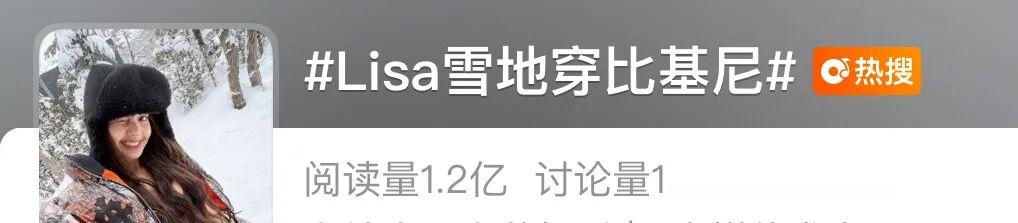 紧随其后,Lisa发布了一组在严寒雪地中身着比基尼搭配NOCTA x Nike x Chrome Hearts三方联名羽绒服的照片,以强烈的反差感横扫中、泰、韩、印尼等多国热搜。截至2月9日,#Lisa雪地穿比基尼# 的微博话题阅读量已突破1.2亿次。