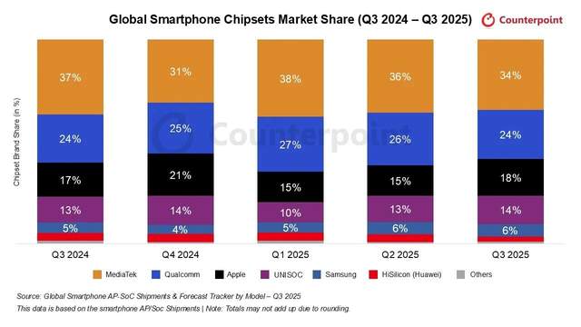近日,有机构发布了截止至2025年三季度,最近5个季度以来,全球手机Soc芯片的市场份额情况,如下图所示。
