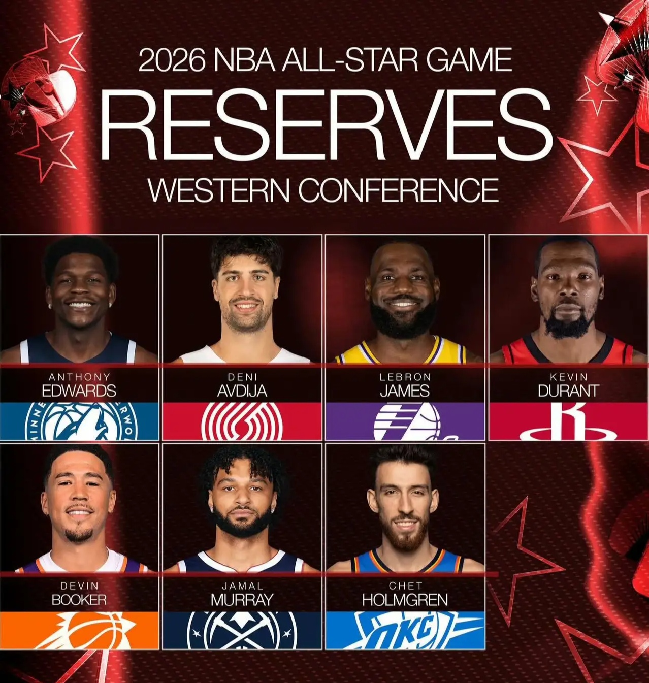 2月2号,NBA官方正式宣布了本次洛杉矶全明星赛的东西部替补阵容,詹姆斯杜兰特成功入选替补阵容,这也是詹姆斯职业生涯第一次全明星替补。