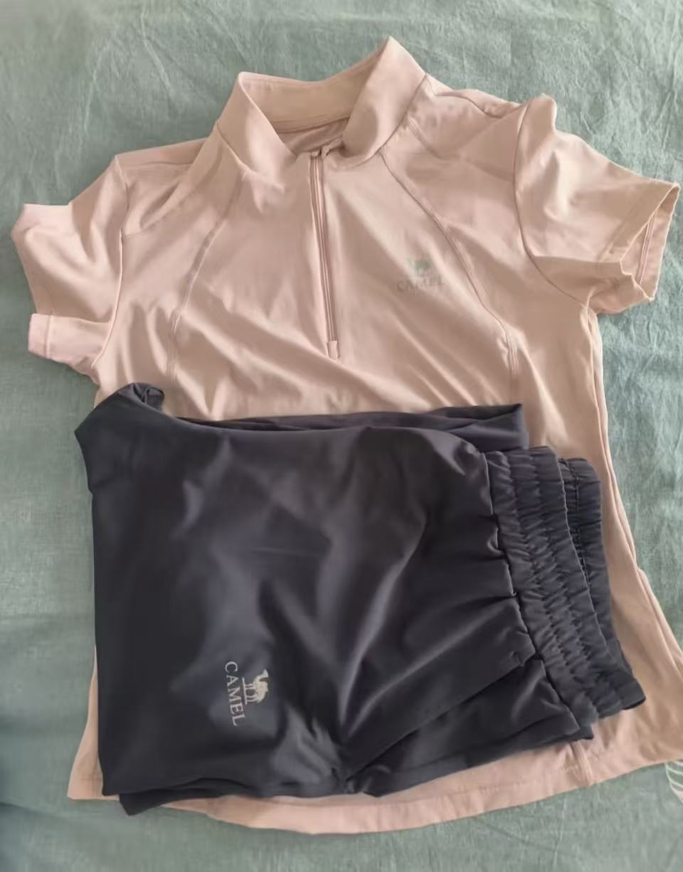 解决了鞋子,衣服买了骆驼的吸湿速干两件套,短袖加长裤,主打暴汗不粘腻,原价768元,到手价只要135元,接近1.8折。最后选了冰兰紫上衣搭配灰黛紫裤子,配色清爽不张扬。穿出去快走拉伸,出汗后衣服完全不黏身;松紧腰设计不勒肉,膝盖弯曲灵活,再也没有湿衣服粘身脱不下来的狼狈。