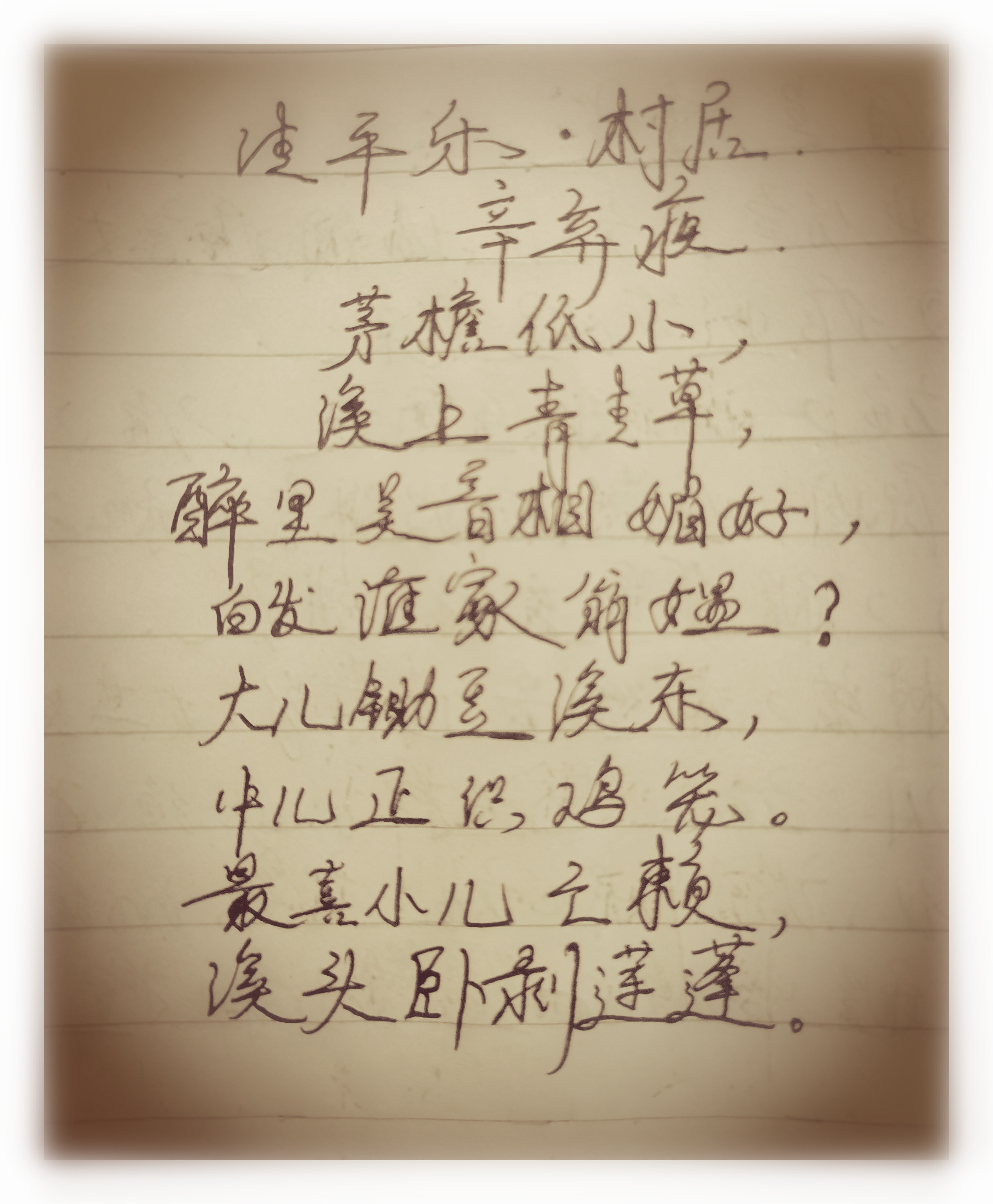 《清平乐-村居》作于辛弃疾闲居带湖期间。由于辛弃疾始终坚持爱国抗金的政治主张,从二十一岁南归以后,他一直遭受当权投降派的排斥和打击。从四十三岁起,他长期未得任用,以致在信州(今江西上饶)闲居达二十年之久。理想的破灭,使他在隐居中更加关注农村生活,写下了大量的闲适词和田园词。这首《清平乐·村居》就是其中之一。