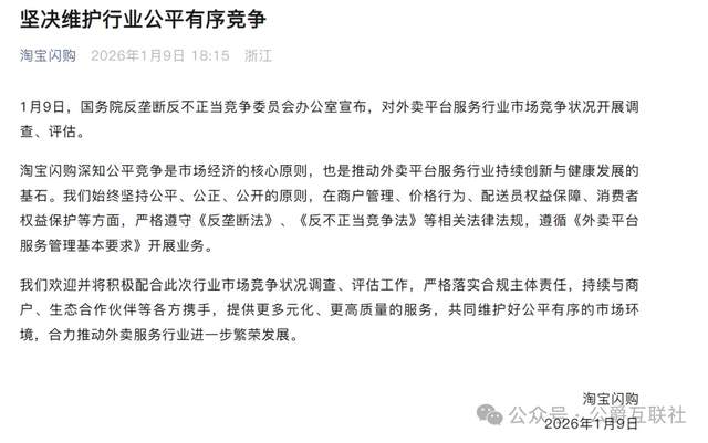 昨天还在高喊要拿“第一”的淘宝闪购,今天就迎面撞上了监管红线。1月9日,国务院反垄断反不正当竞争委员会办公室宣布,对外卖平台服务行业启动调查评估,核心直指“反内卷、反非理性竞争”。