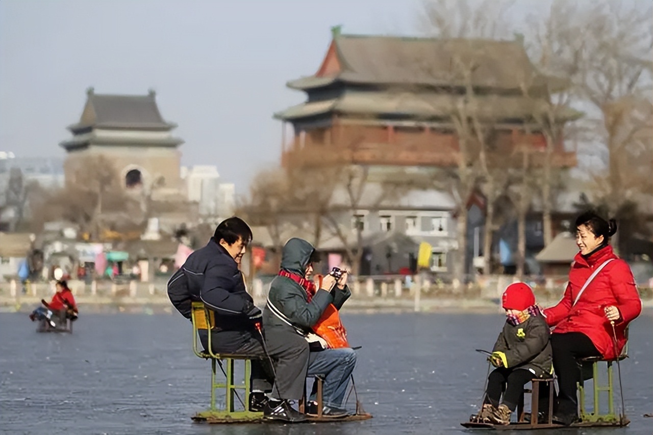 北京什刹海冰场,一家人正享受冬日冰雪之乐