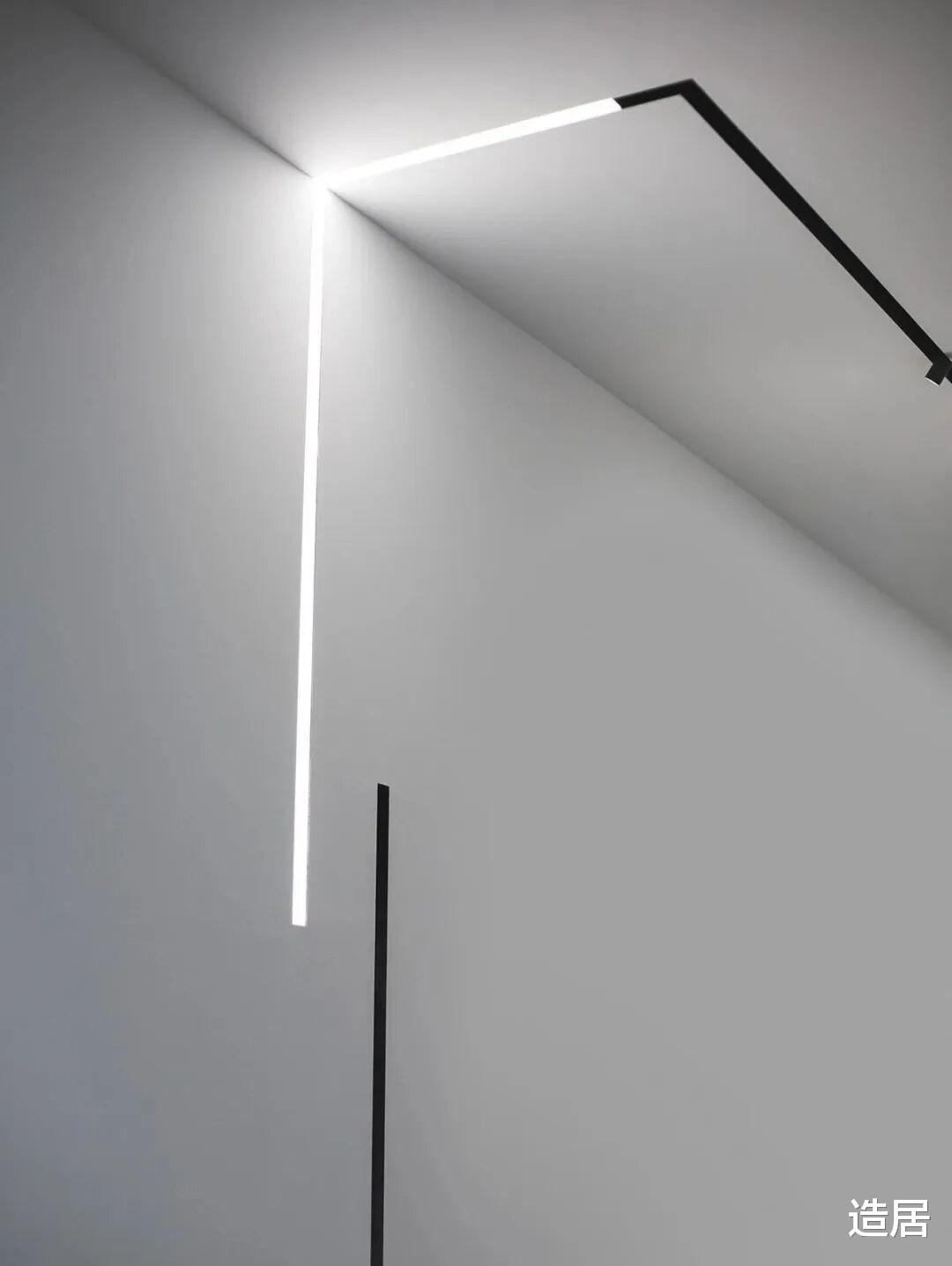 很多业主觉得吊顶越高,无主灯的效果越好,其实完全没必要。现在市面上有很多薄款嵌入式灯具,筒灯的厚度只要 8cm 左右,线性灯的铝型材厚度也只有 5cm,常规 15-18cm 的吊顶,完全能隐藏这些灯具,既不会压抑,又能保证灯光效果。