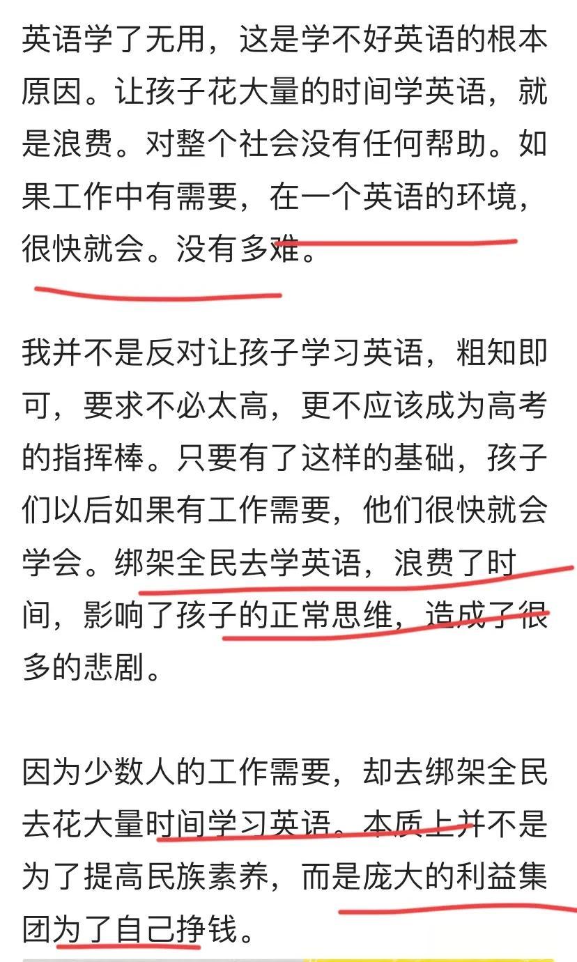 甚至提到因为少数人的工作需要,绑架全民去花大量时间学习英语。是庞大的利益集团为了挣钱。