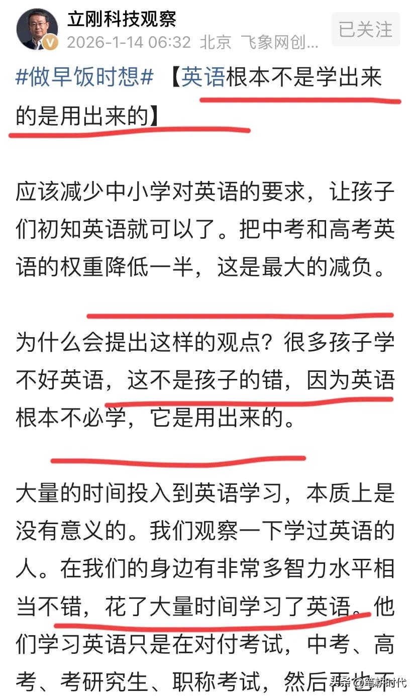 在他说的这些观点中,有个核心观点是认同的,对学生英语要求很高,难度大,增加学生负担。降低中高考的分值权重。