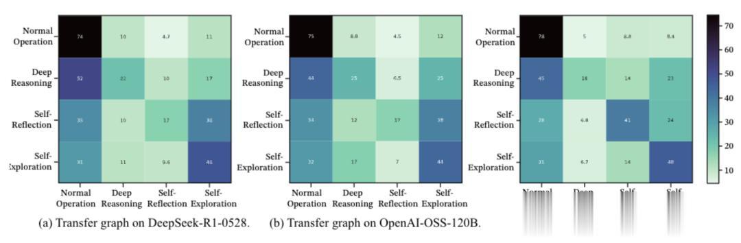 第一步,从强推理模型(比如R1、QwQ、gpt-OSS)的推理链里,抽出一张行为转移概率图。
