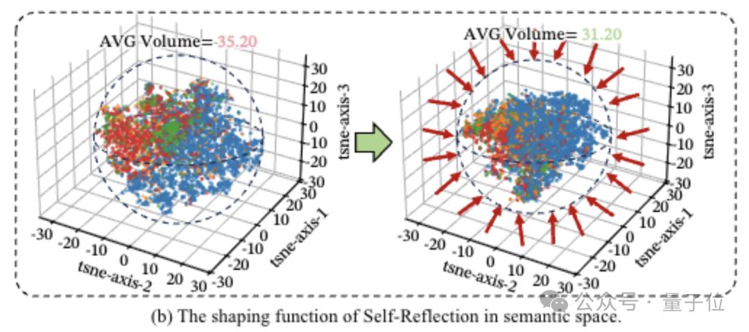 还对比了反思前后的思维范围,反思前,语义空间体积是35.2,反思后,直接压缩到31.2。