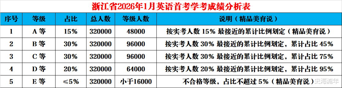 2026年1月30日下午4时左右,浙江省2026年1月首考成绩公布。浙江省外语首次考试实行“一考两用”,成绩既用于评定学业水平等级又可用于高考。学考等级划分遵循以下核心规则: