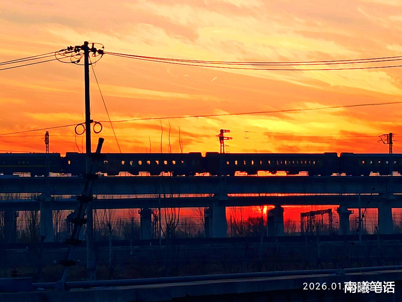 当我站在路旁,沉浸在晚霞的绚丽之中时,忽然,我的目光被眼前的火车轨道吸引住了。只见一列火车正缓缓地从轨道上驶过,它从北京的方向驶向京外,仿佛是带着人们的梦想和希望,驶向远方。在日落和晚霞的映照下,火车的轮廓被勾勒得格外清晰,它慢悠悠地行驶着,发出有节奏的轰鸣声,那声音,仿佛是大自然与人类共同谱写的一首美妙乐章。