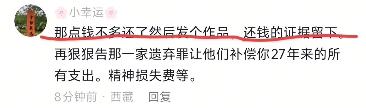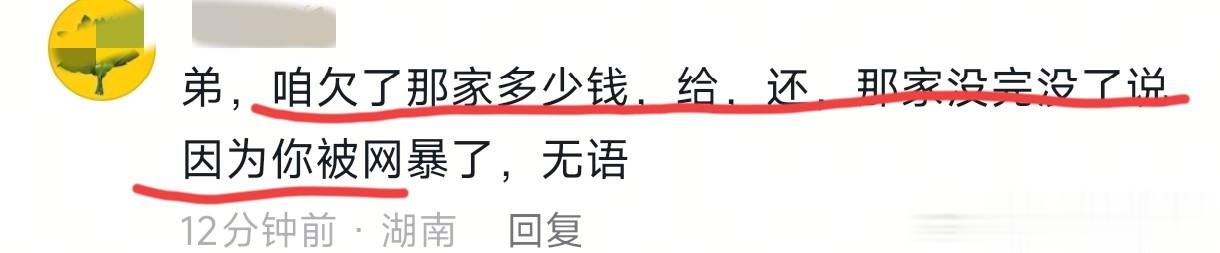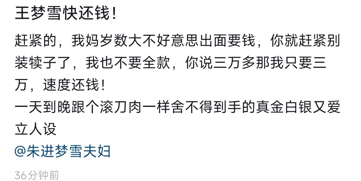 弟弟在视频下面说:王某雪快还钱,赶紧的,我妈岁数大,不好意思出面要钱,你就赶紧别装犊子了,我也不要全款,你说3万多那我只要3万,速度还钱,一天到晚跟个滚刀肉一样,舍不得到手的真金白银,又爱你人设。