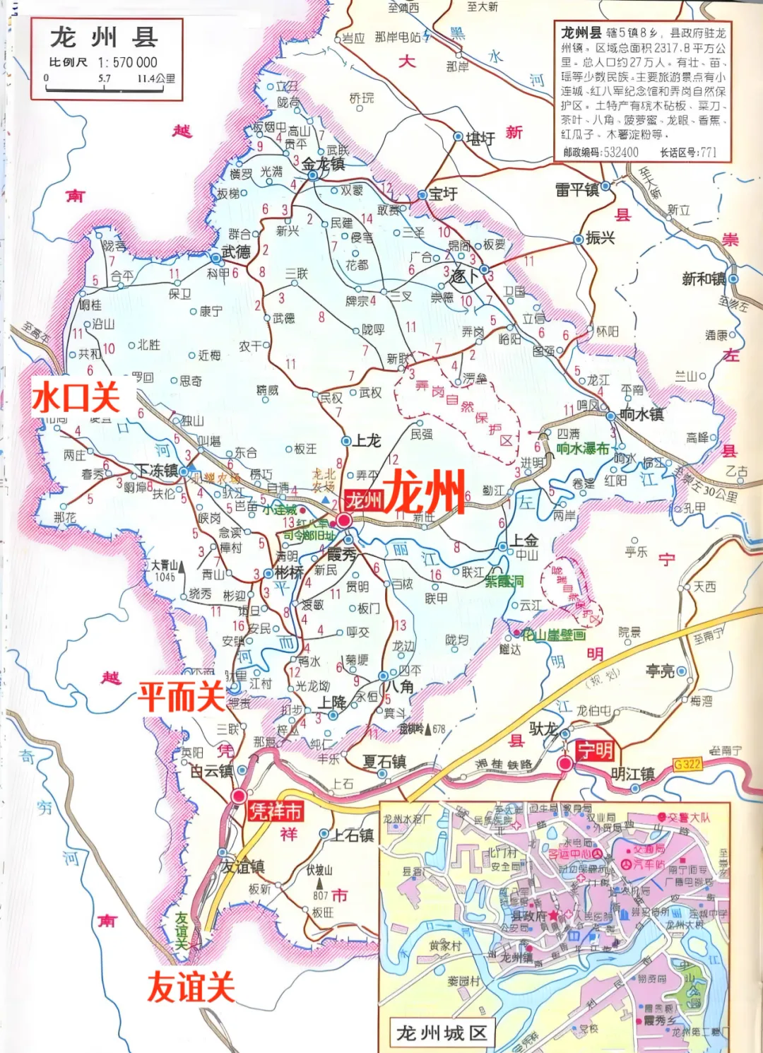 龙州县,现为广西崇左市辖县,东邻崇左江州区,南接宁明县、凭祥市,东北面与大新县相连,西北与越南接壤。龙州恰好位于中越边界广西段的中心点之上,是边防三关(镇南、平而、水口)的锁匙,有“一镇(龙州镇)锁三关”的说法,堪称“边锤重镇”。