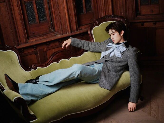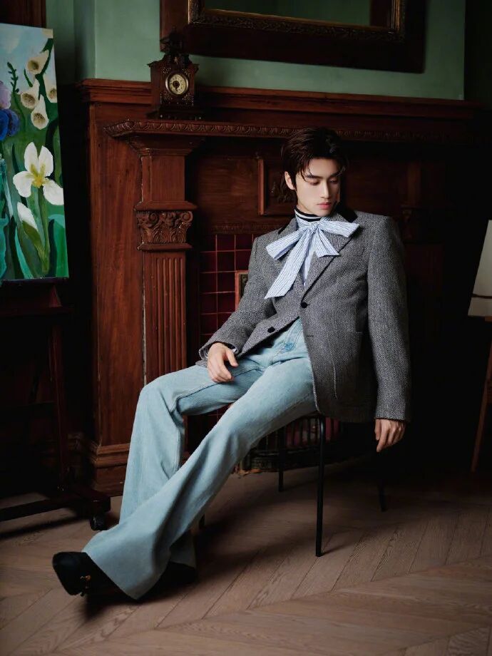 西装 + 牛仔的适配密码:他穿的 VALENTINO 2026 早春灰西装,是 “复古感的底色”—— 毛呢质感的浅灰自带文艺滤镜,利落肩线不绷不硬,刚好衬出少年的舒展;搭的浅蓝牛仔裤是 “现代感的松弛”,但选的是水洗做旧的淡蓝(不是亮蓝街头款),色调和灰西装的柔和感完全同频。金句:正装混搭休闲从不是 “乱穿”,是 “质感同频 + 风格锚点” 的精准适配 —— 灰西装的 “柔复古”,要配淡蓝牛仔的 “旧松弛”,才不是正装搭街头的割裂感。