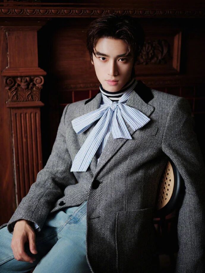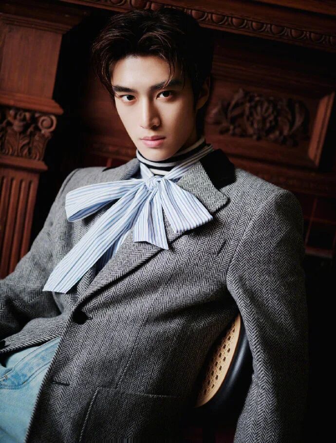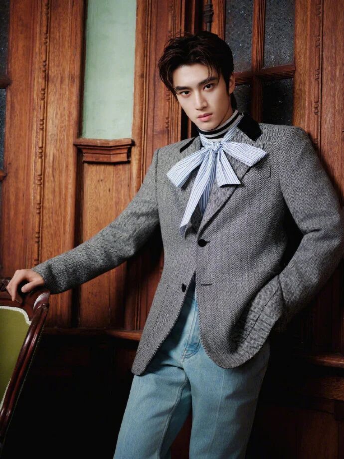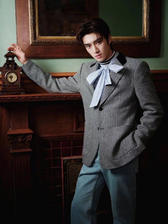 蝴蝶领结的 “文艺锚点”:没系普通领带,偏选了带细纹的蝴蝶领结 —— 这才是 “文艺感的魂”:蝴蝶领结的蓬松感比领带更有复古画报味,细纹元素又和西装的质感呼应,直接把 “俊逸复古” 的标签焊在造型里。见解:复古风的 “点睛” 从不是堆老物件,是选一个 “风格锚点”—— 蝴蝶领结不是装饰,是告诉别人 “我这是文艺挂,不是随便穿”。