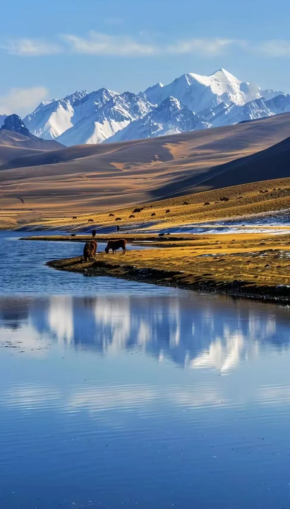 冬日的纳木错,湖面覆盖着厚厚的冰层,阳光洒下,整片湖泊如同镶嵌在藏北高原的蓝宝石,反射着天空与雪山的光影。远处的念青唐古拉山终年积雪,与冰湖相映成趣。