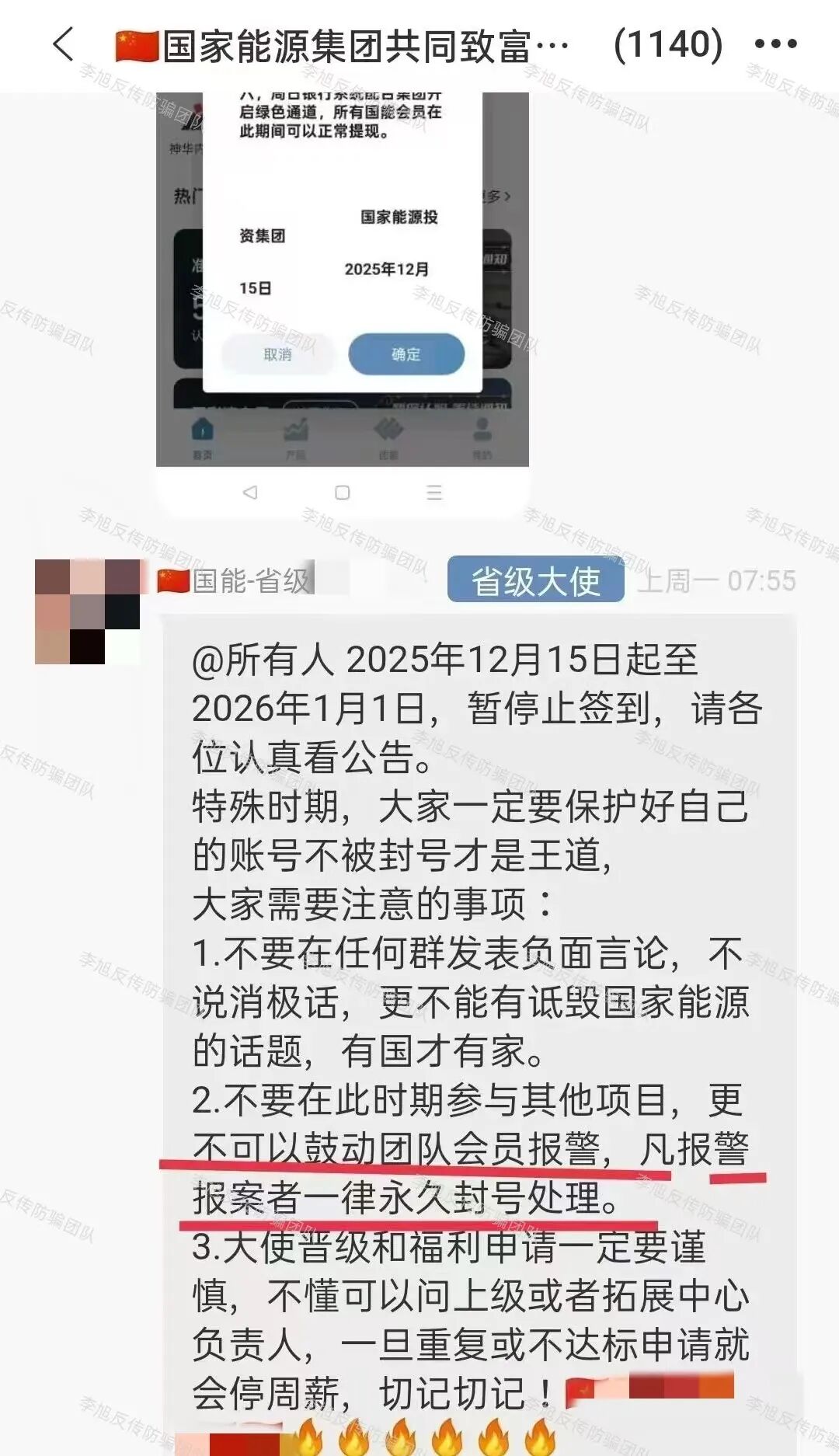 这种迟疑与误解,往往让追损之路更加艰难。好比前段时间时间因为“无法提现”闹得沸沸扬扬的“国能”APP,已经有人公开阻止受害者报案,并威胁“谁报就封谁的号”。这背后的目的,其实是为了拖延时间、干扰调查。