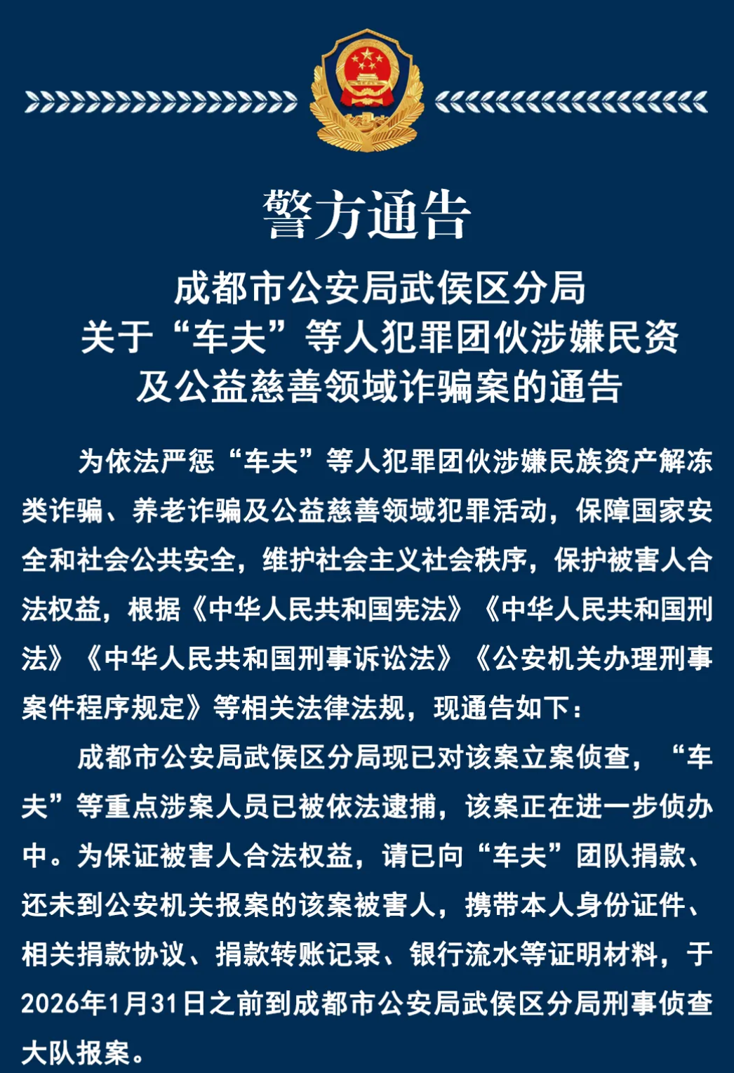 成都市公安局武侯分局发布了关于“车夫”等人涉嫌民资及公益慈善领域诈骗案的通告,呼吁尚未保安的参与者尽快提交证据协助侦办。