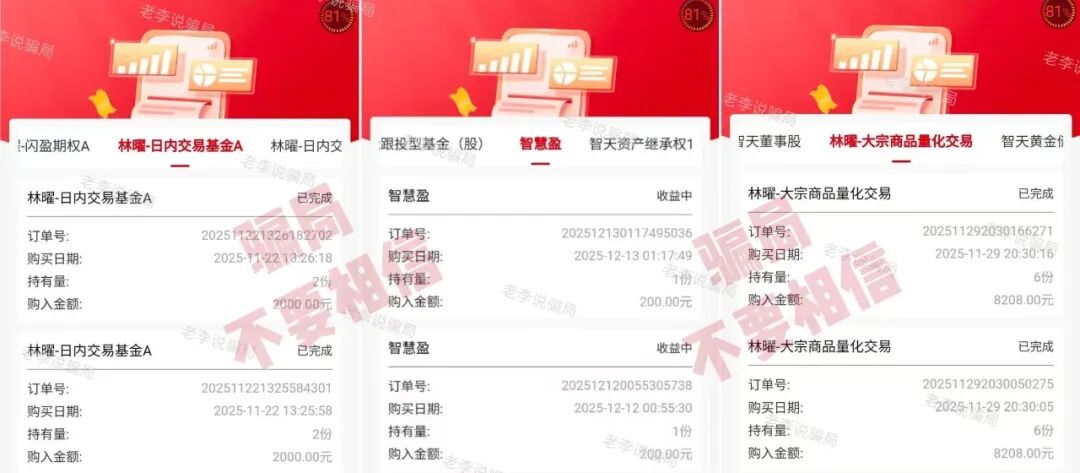 智天系列骗局。打着“邓智天”旗号兜售虚假理财产品,收款方账户为不同的第三方个人或公司。