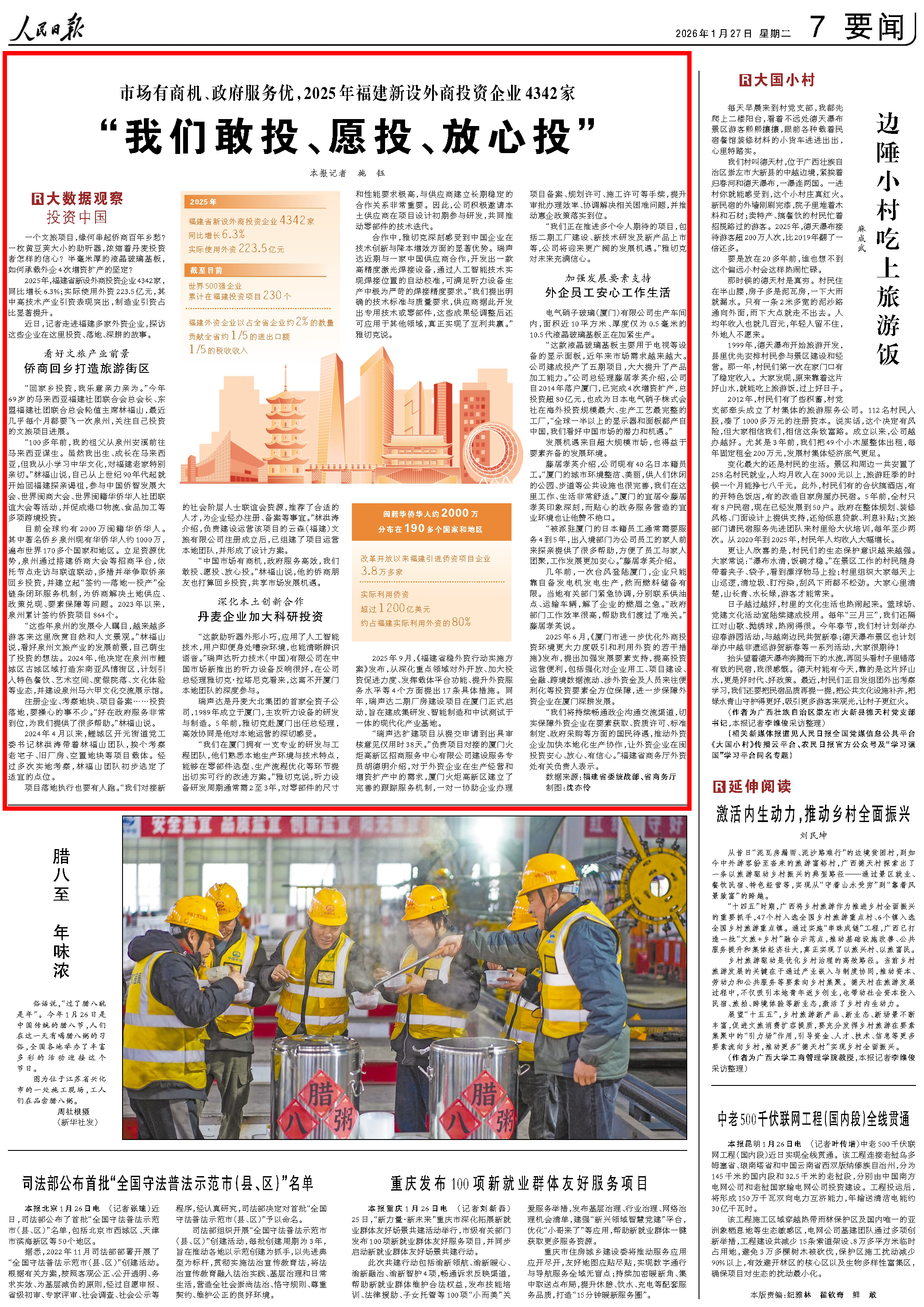 1月27日,人民日报要闻七版刊登题为《市场有商机、政府服务优,2025年福建新设外商投资企业4342家——“我们敢投、愿投、放心投”》通讯,探访外资企业,讲述其在福建投资、落地、深耕的故事。