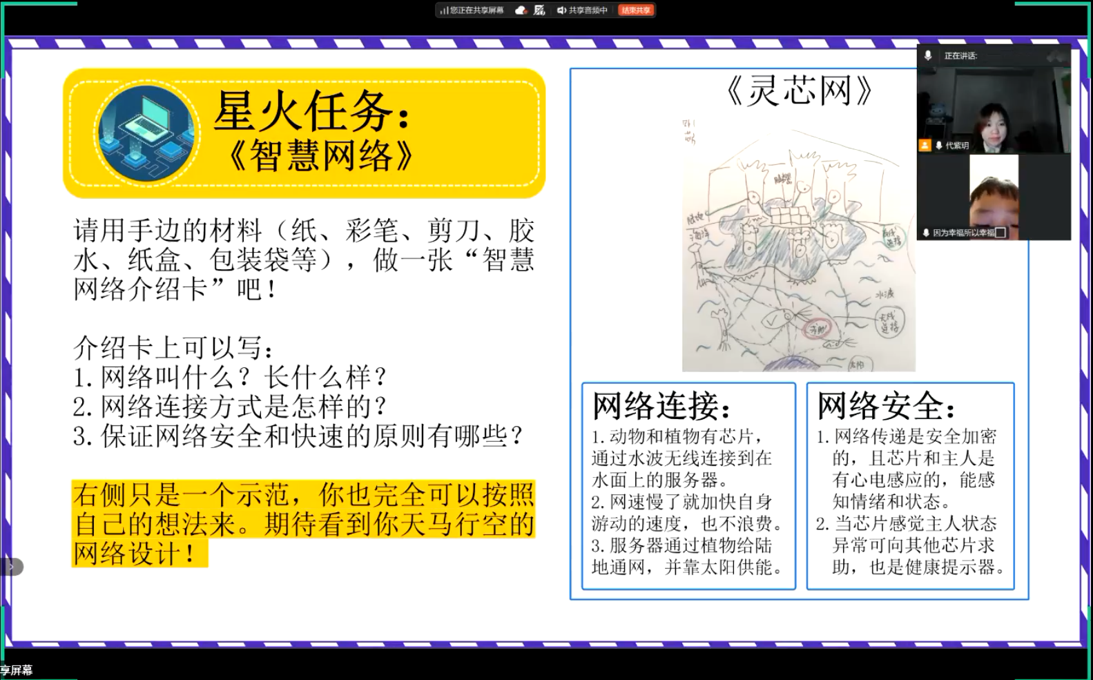 此后的云支教旅程愈发顺畅,在“红领巾爱祖国”的庄重与“星火科学家”的奇趣中,三人一同漫游知识海洋。从星球生态到生命奥秘,从智慧哲思到守护承诺,她们陪肖子恒诵读环保短句,共填“星球介绍卡”,他也牢牢记住了“少浪费,多循环”的环保口诀,珍藏着与星球的“秘密约定”。