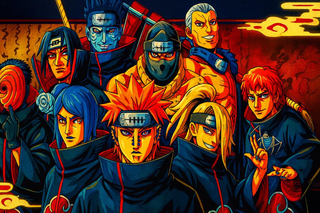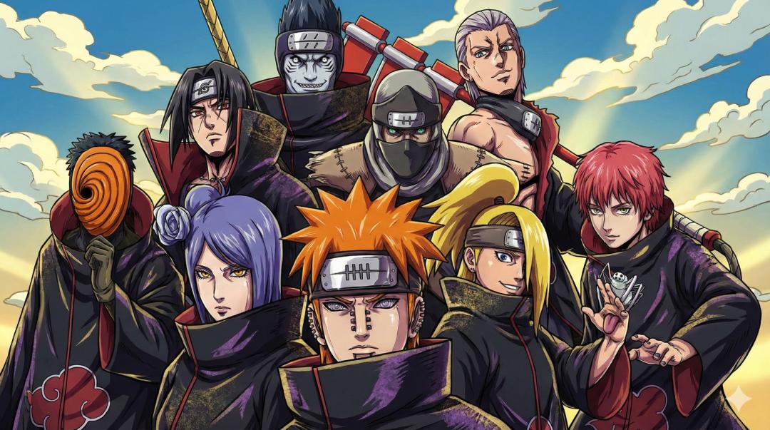 接下来,为了再极致地测试一下 Nano Banana Pro 的细节刻画能力,我们还是用火影忍者的原图,以及 JoJo 的画风,但要增加人数,比如八人的晓组织。