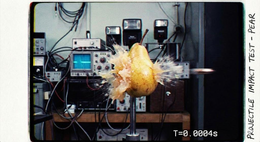 一颗子弹高速穿过一颗梨的瞬间。实验室实拍,分辨率较低。