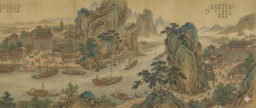 要知道,原版《 清明上河图 》刻画的只有一个城市,也就是北宋都城汴京( 今河南开封 )的汴河两岸繁华景象,现在要切换到整个长江流域,跨度差距非常大,很考验模型的抽象能力和把抽象概念具像化的能力,并且结合中国古画 “ 在意不在形 ” 的特点( 在我们这个测试中通俗理解就是,画中场景一般不存在现实中,且有诸多不合理之处,但能表达作者的意图 )。