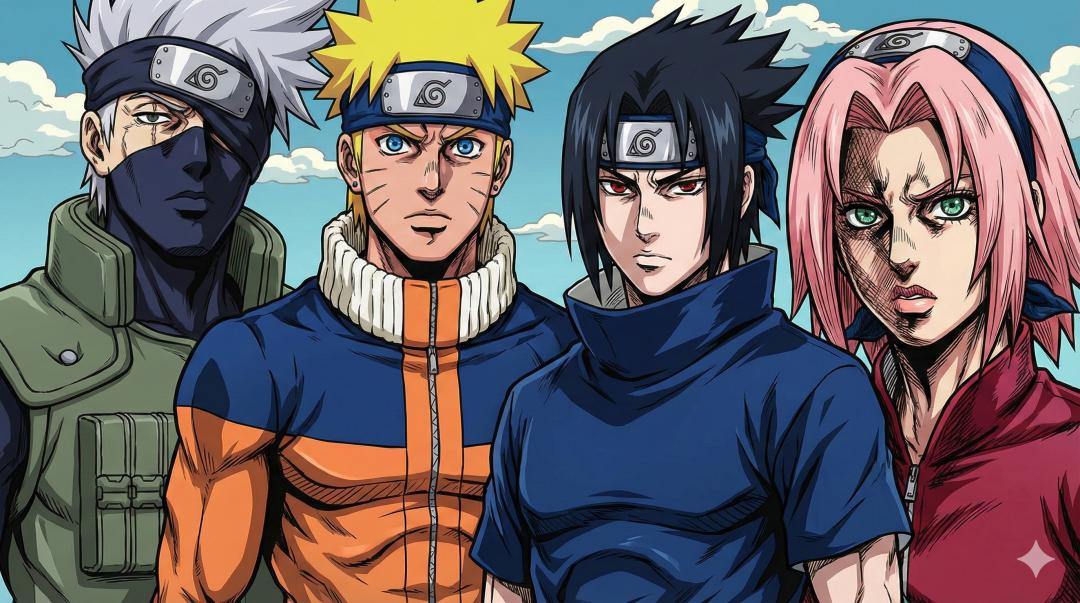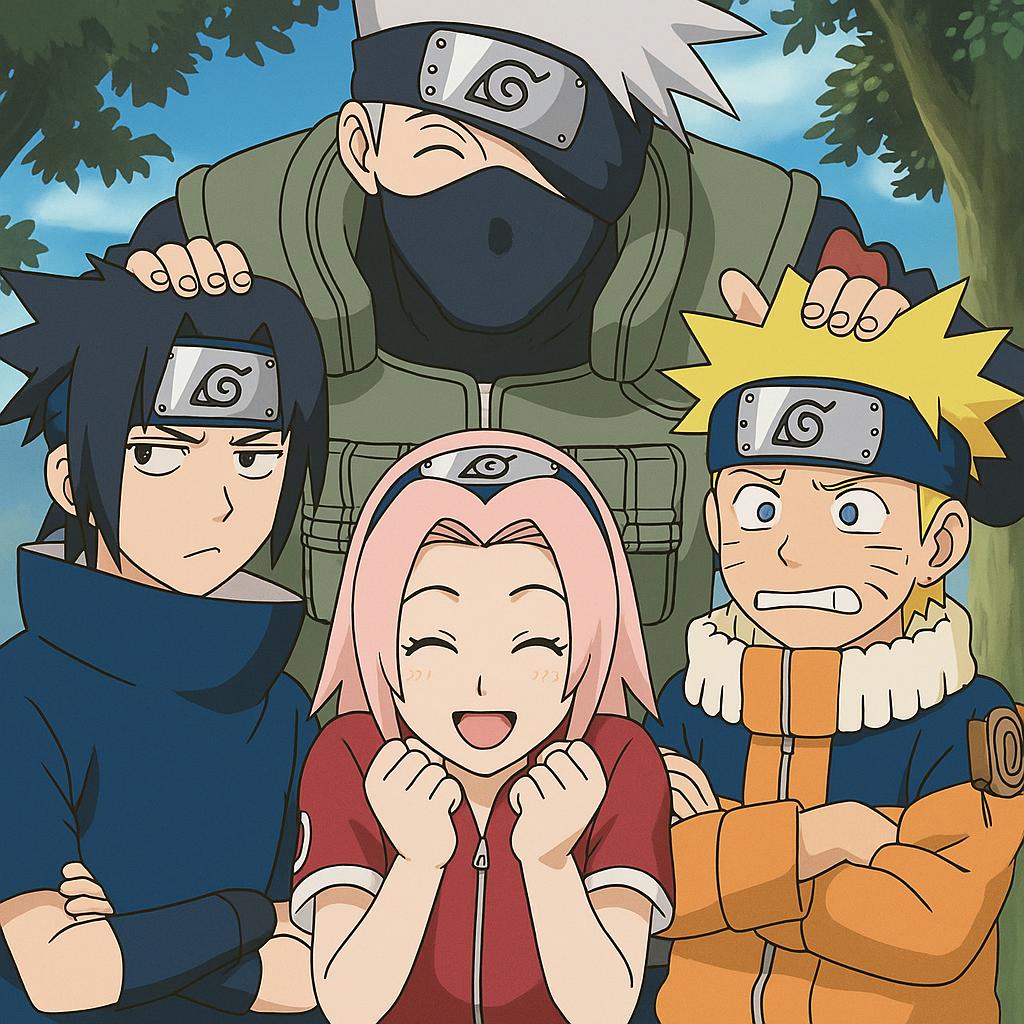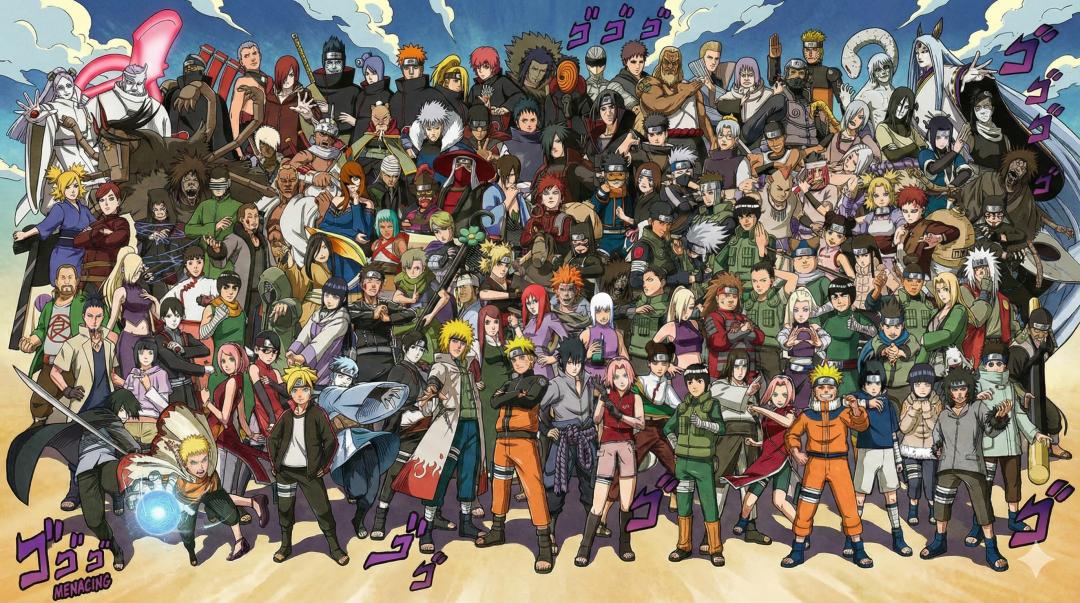 我们以《火影忍者》的一张经典第七版合照为原图,并用以下三个画风比较特别的动漫来做画风转换测试: