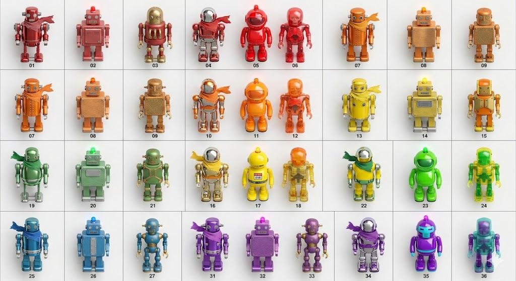 首先是直接批量生成 36 个 呈 6*6 网格排列的玩具机器人阵列,并且每个机器人的具体特征需要经过进一步推导才可得出,综合考验推理能力和生图能力,提示词会列出机器人基于行的颜色特征和基于列的表面特征。