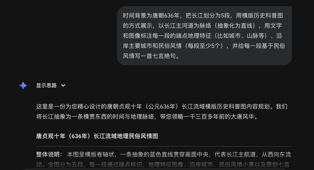 为此,我们提高对明确信息的要求,让 Nano Banana Pro 在每一段呈现 5 个民俗点,并写一首七言绝句,以唐朝为背景。