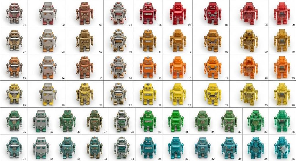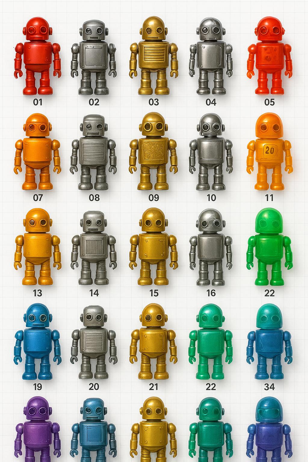 Nano Banana Pro 大幅提高了生成质量,画面比例选择、网格编排、机器人编号、颜色行一致性基本都没有问题,表面列一致性上会有较大波动,但整体保持了相同的材质和表面处理,不同列之间的差异也很明显。