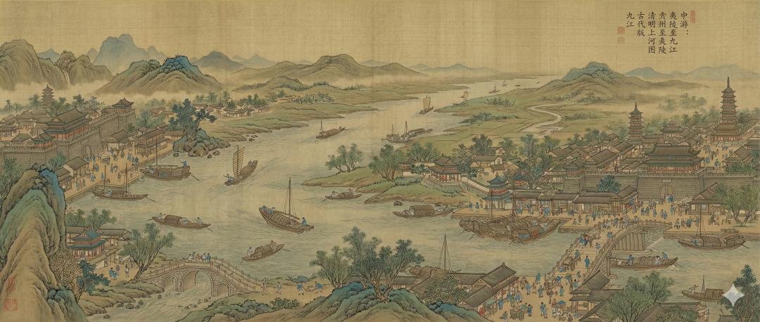 在第三张图 “ 中游:夷陵至九江 ” 部分,Nano Banana Pro 刻画了更加繁荣的城市景象,融入了沿河生活和商业的丰富细节,河流蜿蜒穿过山峦和富饶的平原,形形色色的船只在繁忙的水道上来往。