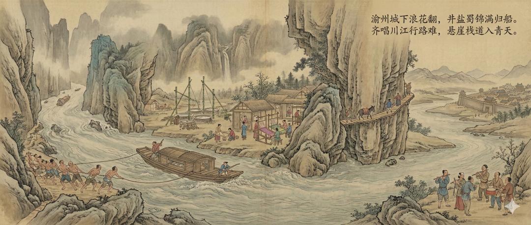 Nano Banana Pro 在图像左侧展现了长江的源头:白雪皑皑的山峰、牦牛和茶马商队,体现了藏族和彝族文化。图像右侧则聚焦于叙州,描绘了城墙、熙熙攘攘的码头、餐馆和热闹的集市,以及众多活跃的人物。江面上也充满生机,描绘了货轮、小渡船和船夫,展现一幅繁荣的贸易景象。