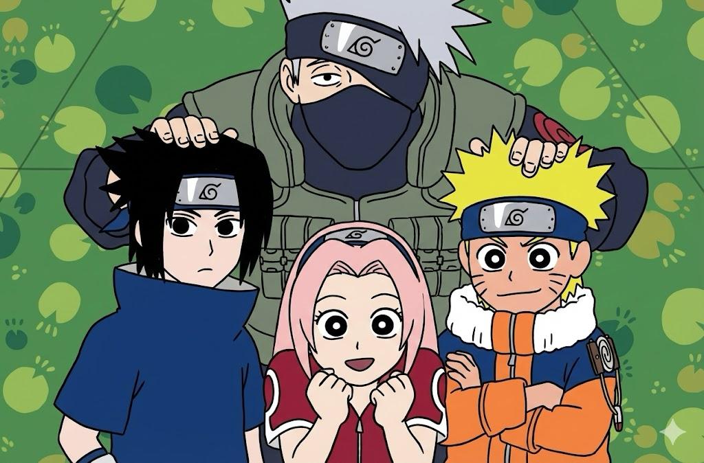 一眼精巧,除了卡卡西,基本每个人的表情都表达了相同的情绪,三个年轻忍者的体型都变成《 名侦探柯南 》那种头大身小的风格,但细看又有很多问题,背景被替换成了参考图的背景,三个年轻忍者的站位都变了,鸣人没有怒视佐助。