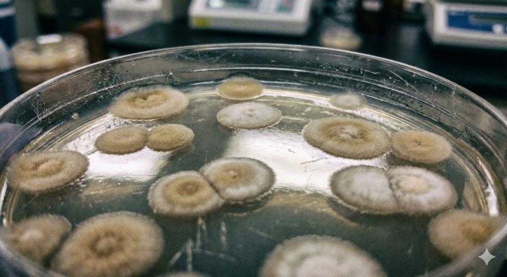 培养皿中的细菌菌落特写,琼脂表面有反光,菌落呈现不规则的圆形,边缘有绒毛感。实验室实拍,分辨率较低。
