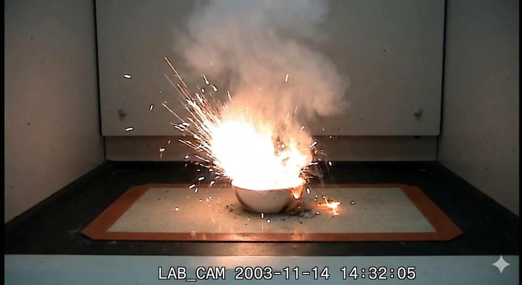 铝粉与氧化铁(铁锈)在高温下发生剧烈的氧化还原反应,火花四溅,实验室实拍,分辨率较低。