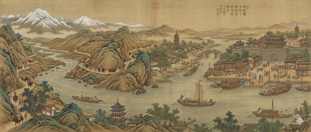 请将“上游一段:金沙江至叙州”部分转换成清明上河图画风,横版图片,长江从图片左侧流入,从图片右侧流出。