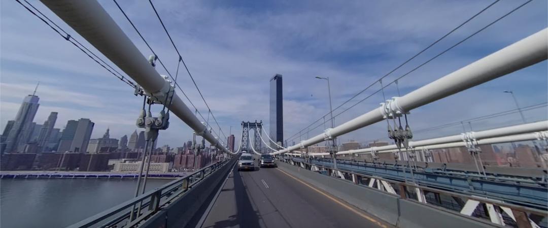 画出从这张图的中央位置的大桥的左端驾车前进的视图。